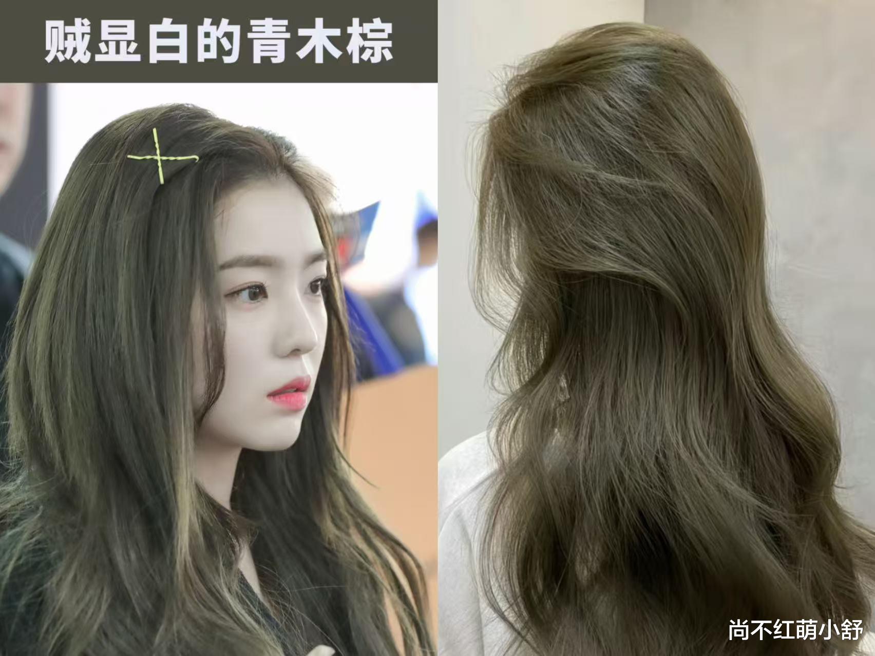 青木棕是在棕色基础上加入了灰绿色调,室内光线下偏棕,阳光下则会透出淡淡的青调,非常特别。很多明星染过这个颜色后直接被夸“颜值巅峰”,整个人看起来年轻又时髦。裴珠也尝试过类似的颜色,很好地衬托出她的的肤色。