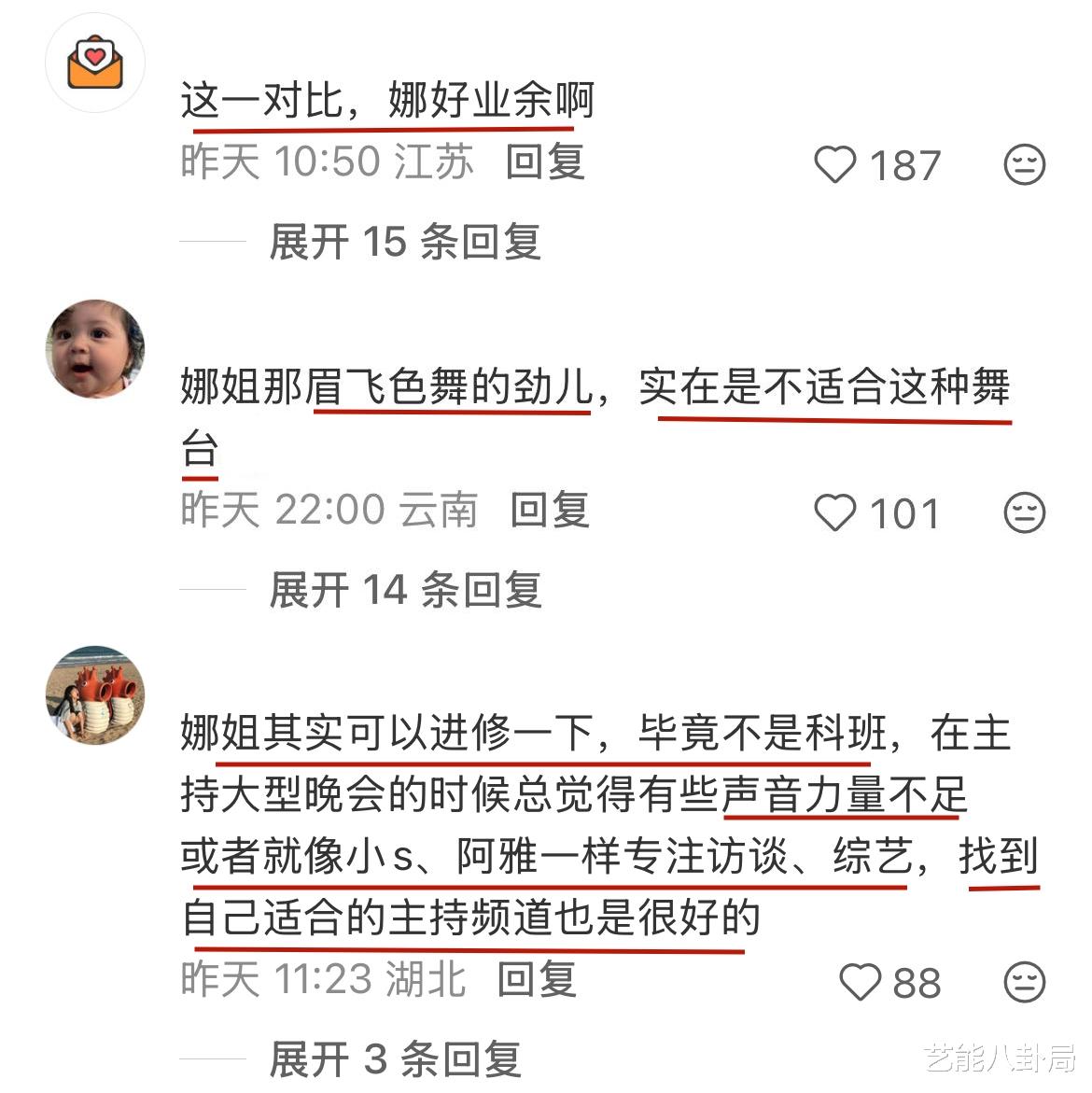 不看好的网友则觉得,综艺主持人的身份显然更适合她,强行向大型盛典主持跨越,看着还是有点吃力。