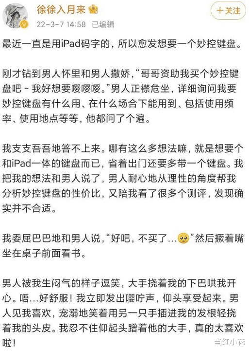 再后来,一位ID为“徐徐入月来”的女孩在网上分享自己的恋爱日常。