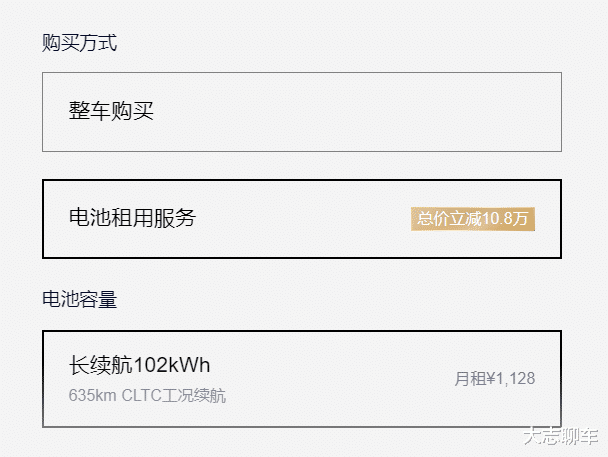 再然后,如果车主选择的是租电版本,现在100度电池包,一个月租金是1125元,付4送一,一般情况下, 车主租电都是一年租算起,一般也就是902元一个月,但考虑到有些车主,会把电池包换成75度的,租金是728元,实际电池包是583元每个月,租电一年成本是10824元,75度是6996元,选择租电,保险费会直接降低1000元。