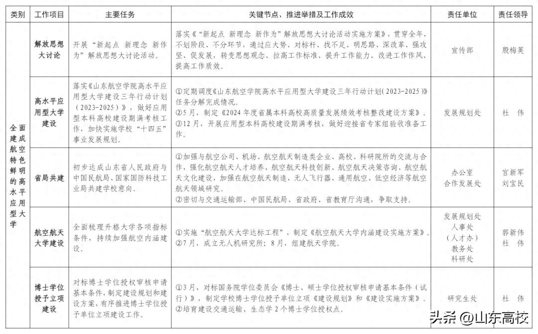 《山东航空学院2024年工作要点》也明确提出了“聚力推动省局共建、航空航天大学和博士学位授予单位培育建设”。根据《山东航空学院2024年重点工作安排表》,山东航空学院已经初步达成山东省人民政府与中国民航局、国家国防科技工业局共建学校意向;实施“航空航天大学达标工程”,制定《航空航天大学内涵建设实施方案》,并计划于7月成立无人机研究所,8月组建航天学院;培育建设交通运输、生态学2个博士学位授权点。
