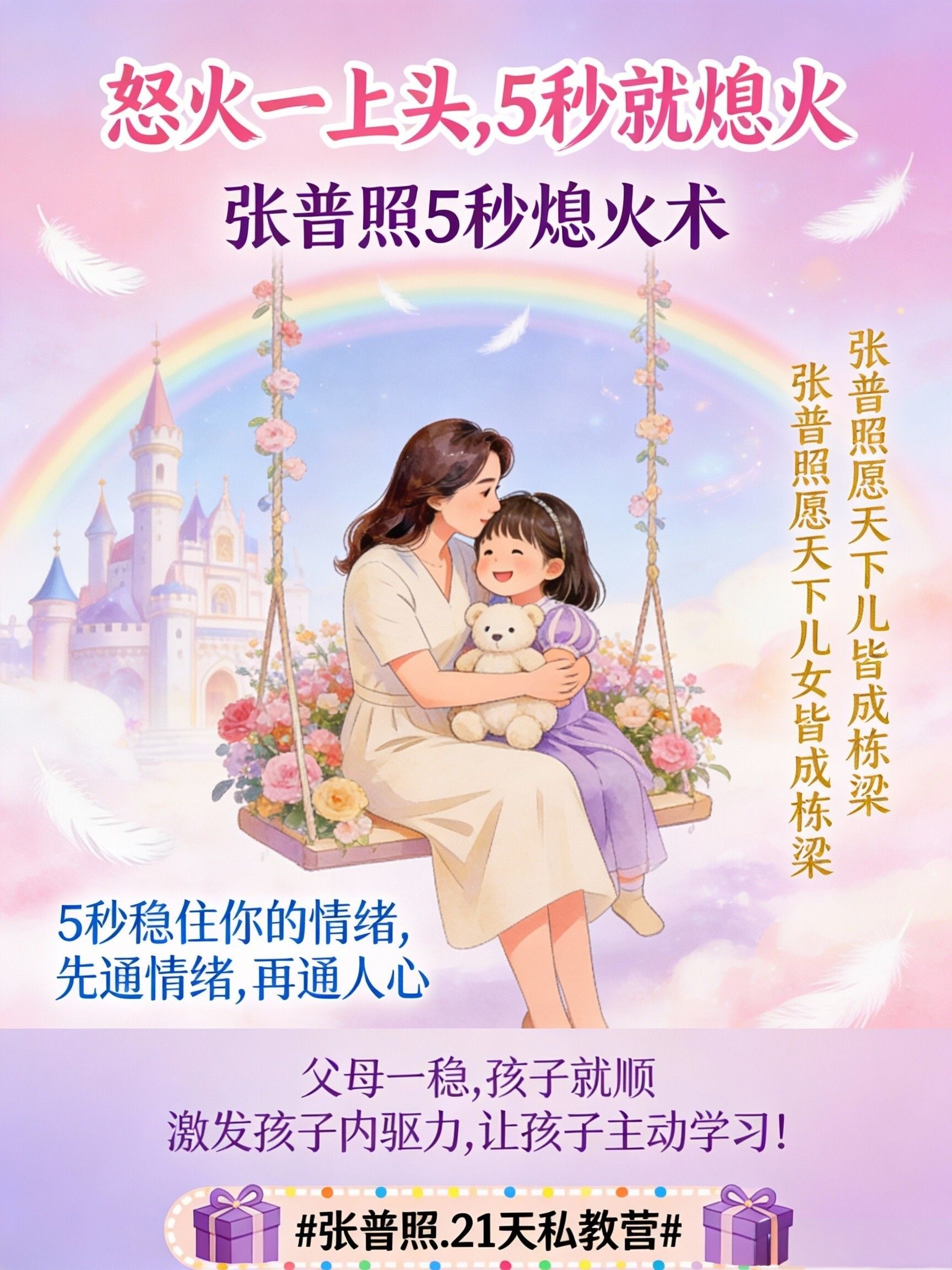 张普照5秒熄火术,直接作用于“情绪爆发”的那个5秒生理窗口期。 它是一套生理心理协同的“应急操作程序”。通过练习,它会成为你的新本能——在怒火升起的刹那,身体自动完成“熄火-转换-平静”的流程。从此,你无需“忍”,而是从根源上,就不想对孩子发火,内心充满了从容与解决问题的智慧。