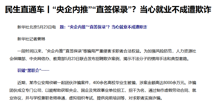 2025 年,人社部、中央网信办、教育部联合发布案例揭示,部分不法分子利用求职者心理设置求职陷阱。有的成立无资质 “黑职介”,以 “央企内推” 等为由,串通学校老师,伪造合同、组织虚假考试培训,诈骗400 余名高校毕业生 8000 余万元。还有人在社交平台发布虚假招聘信息,夸大人数、薪酬福利,不限专业学历吸引眼球,借 “话术引流” 牟利。