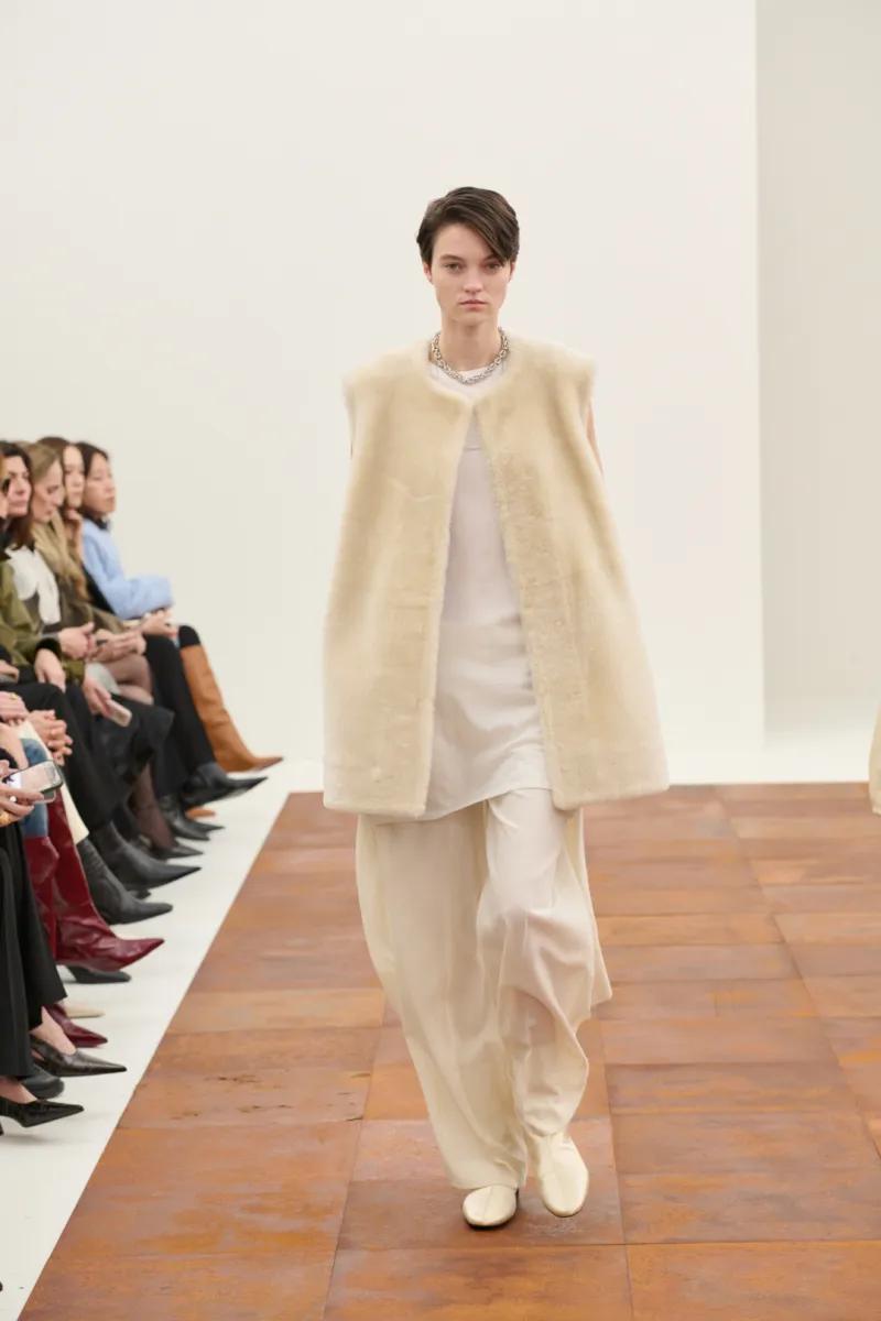 Toteme 2025秋冬系列延续了品牌标志性的干净线条与低调高级感,以极简主义为内核,通过巧妙的材质混搭(如柔软羊毛与硬朗皮革的碰撞)和中性色调(米白、灰褐、深棕的层次递进)打造出适合多种场景的穿搭方案。无论是职场通勤的干练套装,还是周末休闲的随性组合,都能通过细节变化满足不同需求。极简主义的廓形设计与未来感的科技面料(如防风防水材质)巧妙结合,在保持实用性的同时,通过不对称剪裁、隐藏式拉链等细节处理增添设计感。这种“低调的未来主义”既保留了北欧极简的克制美学,又注入了现代科技的温度。