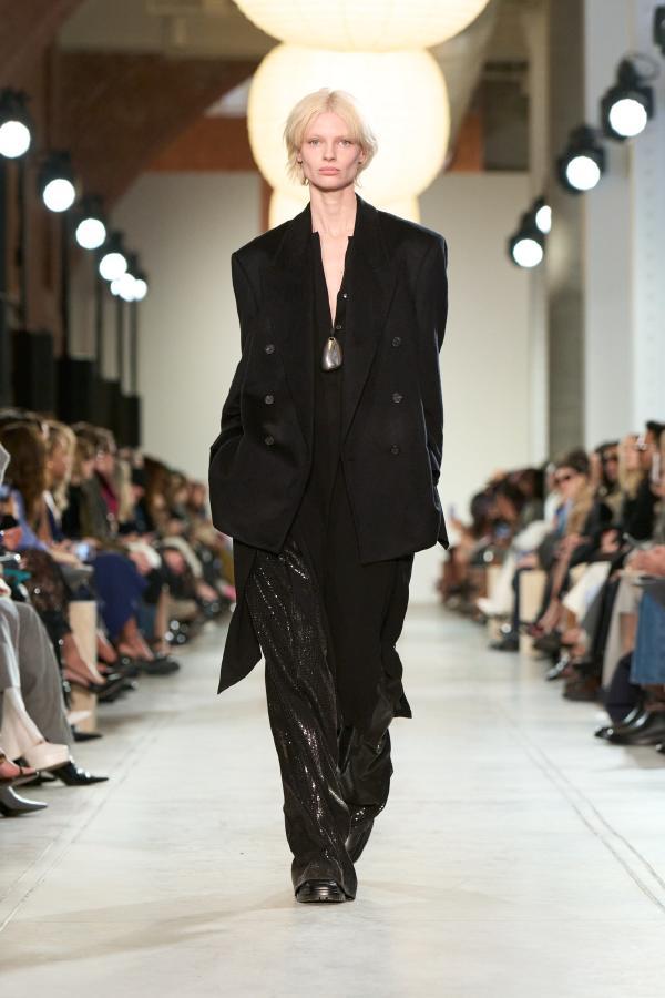 MICHAEL KORS 主打干净利落线条、中性色调以及高科技面料的极简主义风格,宛如时尚长河中的常青树,在时尚舞台上稳稳占据重要地位,持续散发迷人魅力。在秀场上,模特身着驼色套装,宽松的西装外套搭配同色系百褶裙与长裤,线条简洁流畅,中性色调沉稳大气。手中拿着的同色系手包,进一步强化了整体造型的简约感。这种简约纯粹的设计理念,恰似一股清泉,精准契合当下人们对低调品质生活的追求,让穿着者在喧嚣世界中寻得一份宁静与优雅。灰色西装套装同样遵循极简主义,利落的剪裁搭配黑色高领内搭,腰间的黑色腰带为整体造型增添了层次感与精致感,展现出干练的职业风格,无论是商务场合还是日常出行,都能轻松驾驭。