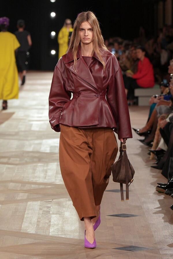 Acne Studios 2025秋冬系列从北欧自然景观中汲取灵感,通过针织、皮质、做旧牛仔等材质的混搭,结合缩短比例的设计(如短款上衣与高腰下装),重塑身体轮廓。这种“自然肌理”与“都市剪裁”的碰撞,创造出独特的视觉张力。极简主义的慵懒垂坠感与未来感的波普色彩(如亮紫、波尔多红)相结合,在自然原始性与都市摩登感之间找到平衡。通过色彩与材质的对比,传递出一种“未完成的精致感”,既保留自然痕迹,又融入现代审美。创意总监Jonny Johansson表示,该系列旨在通过服装表达“对立元素的和谐共存”,如童年记忆中的泰迪熊绒料与都市前卫廓形的碰撞。这种设计哲学不仅体现在材质选择上,更贯穿于整个系列的叙事逻辑中。