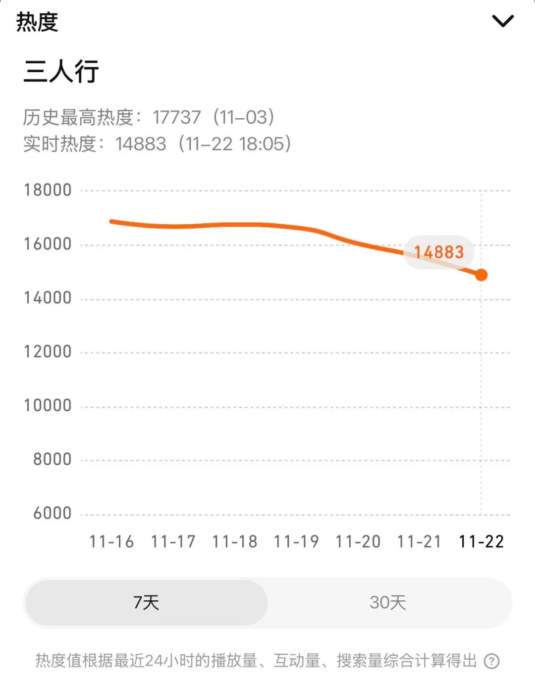 数据显示,《三人行》在腾讯视频站内的历史最高热度为17737,在最能体现分账剧收益的“流行畅销榜”上排在第24位,甚至不敌一些已过热播期的剧集。