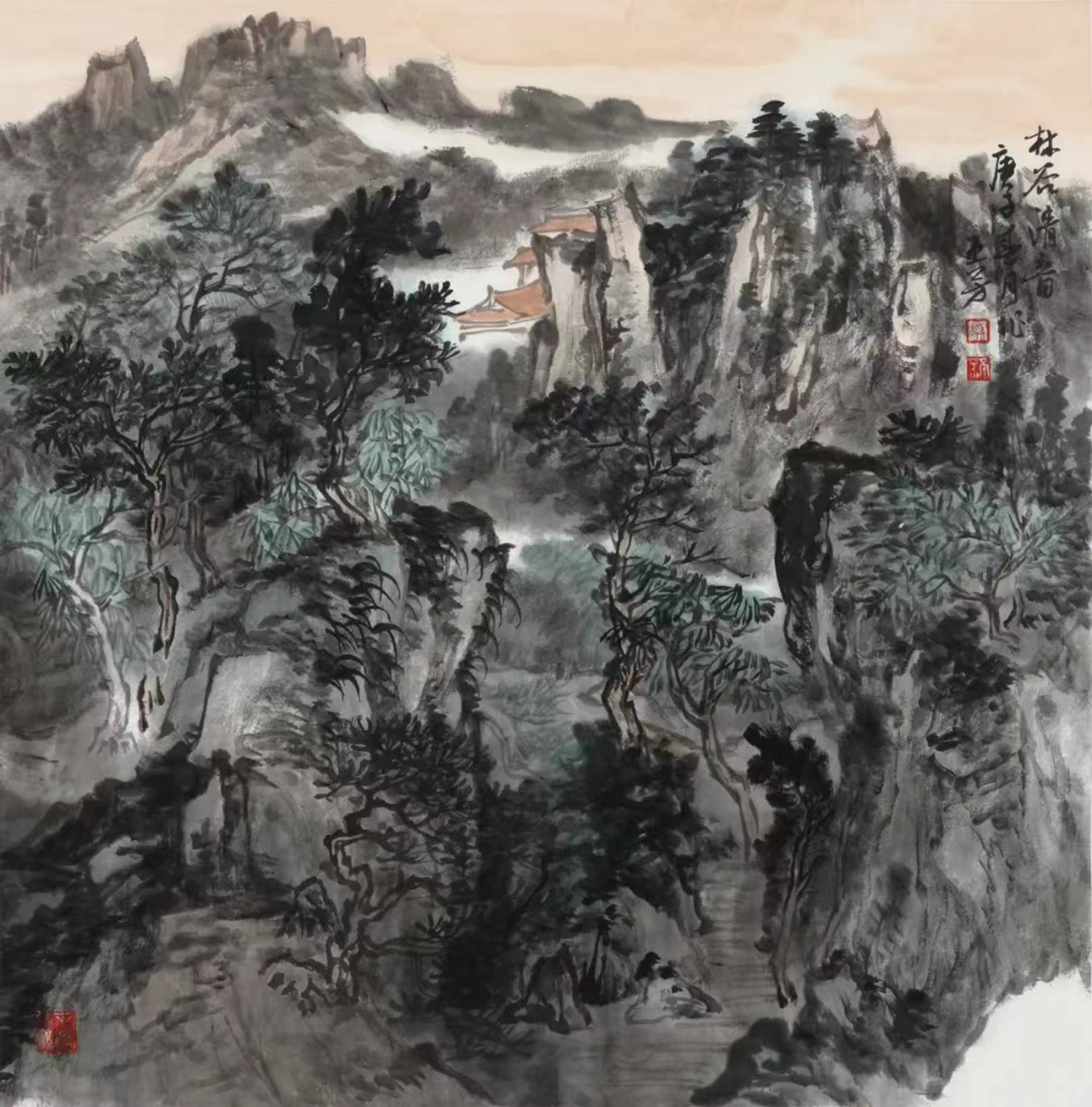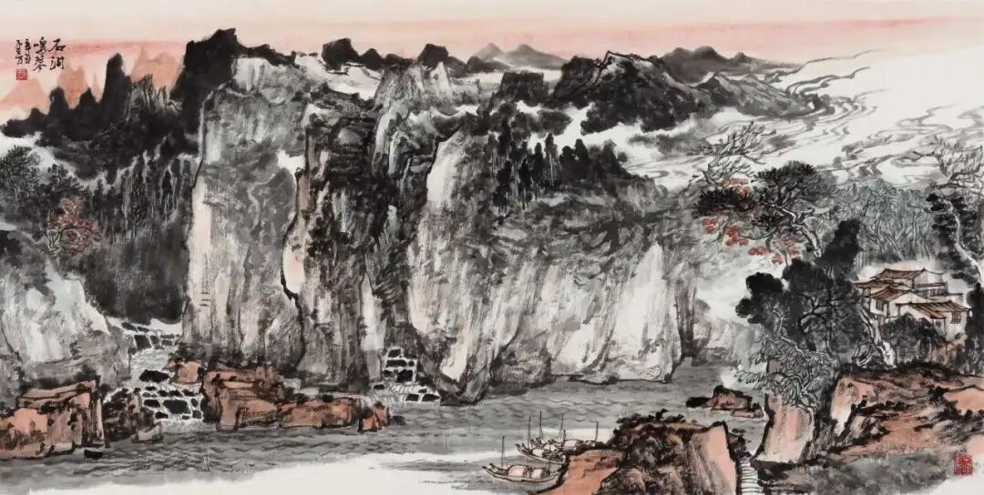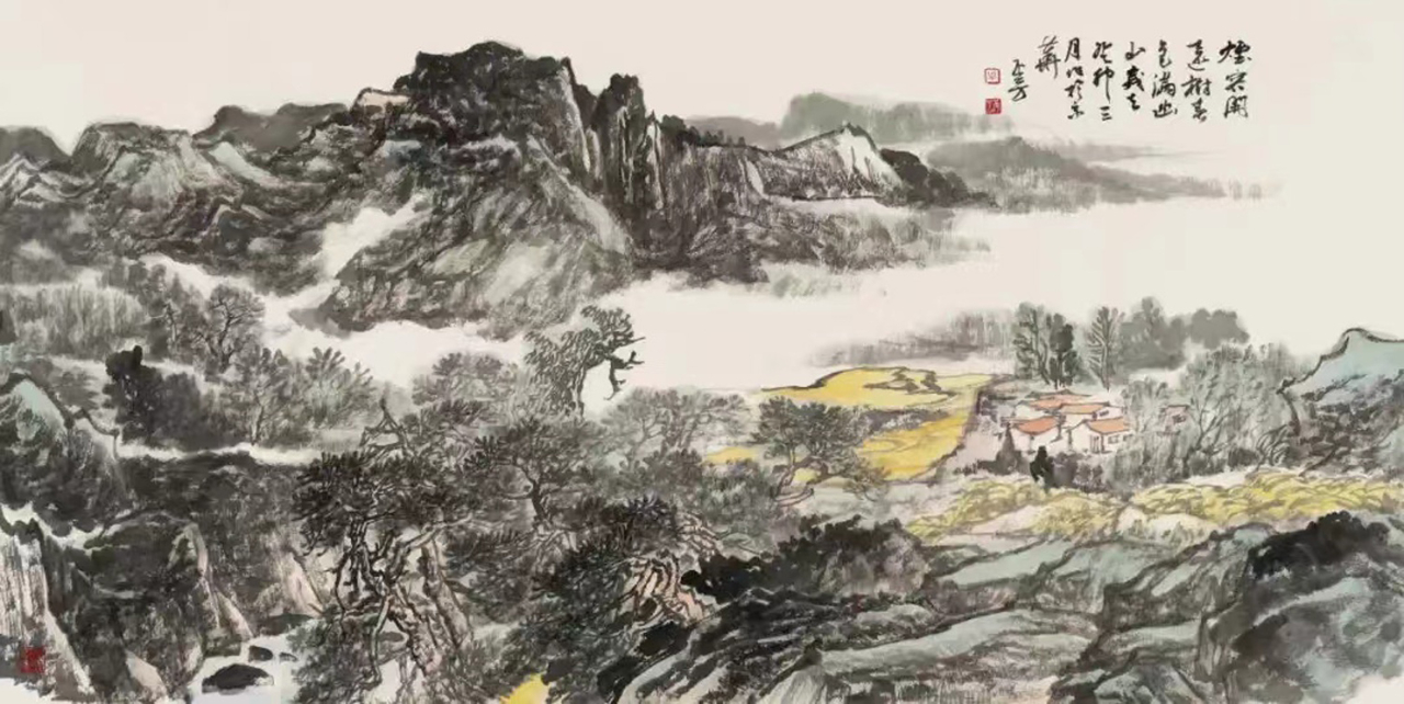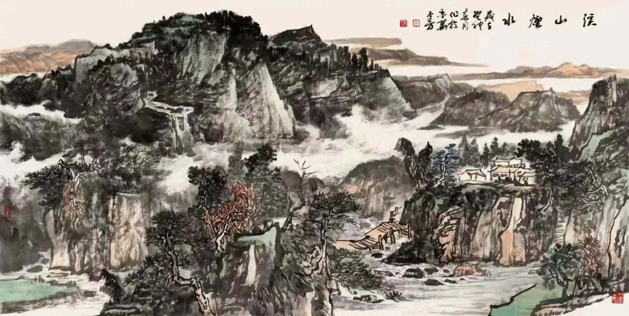 自鲁迅美院笔墨筑基,至中国国家画院意韵深耕,他的笔端攒着传统与新境的和鸣,如春溪汇入江海。他的墨是山河的裁衣针:斧劈皴刻就的崖壁如铁铸的骨,笔锋飞白是岁月裂出的纹;披麻皴晕开的肌理似青苔裹着的暖,积墨层叠是云气浸透的柔。你看那危崖——浓墨是它的脊梁,挺如松立;淡墨是它的呼吸,轻似云游;石缝里的林木都带着笔锋的劲,像剑锋挑开晨雾,像琴弦拨动松风——他把“壁立千仞”的雄与“苔痕上阶”的柔,缝进同一方宣纸,让山既有风骨,又有温度,像春风揉进霜雪,像月光漫过檐角。