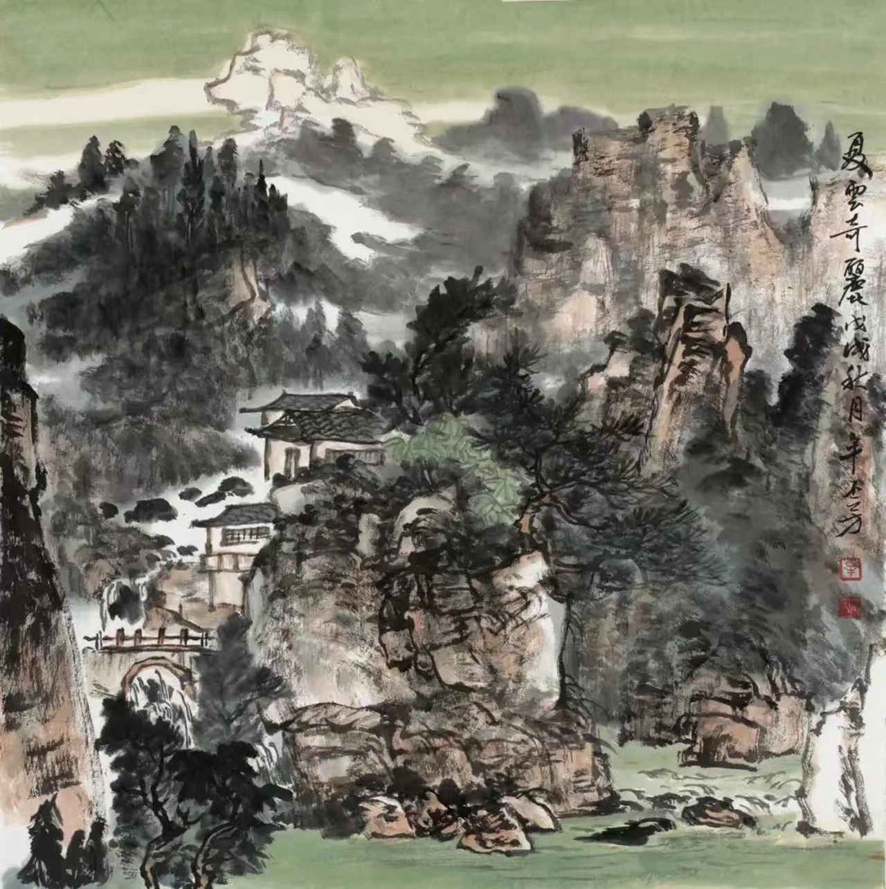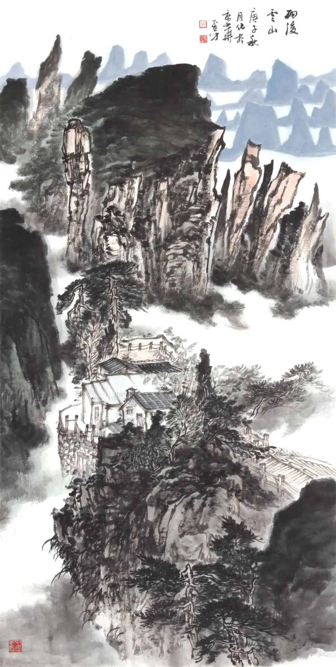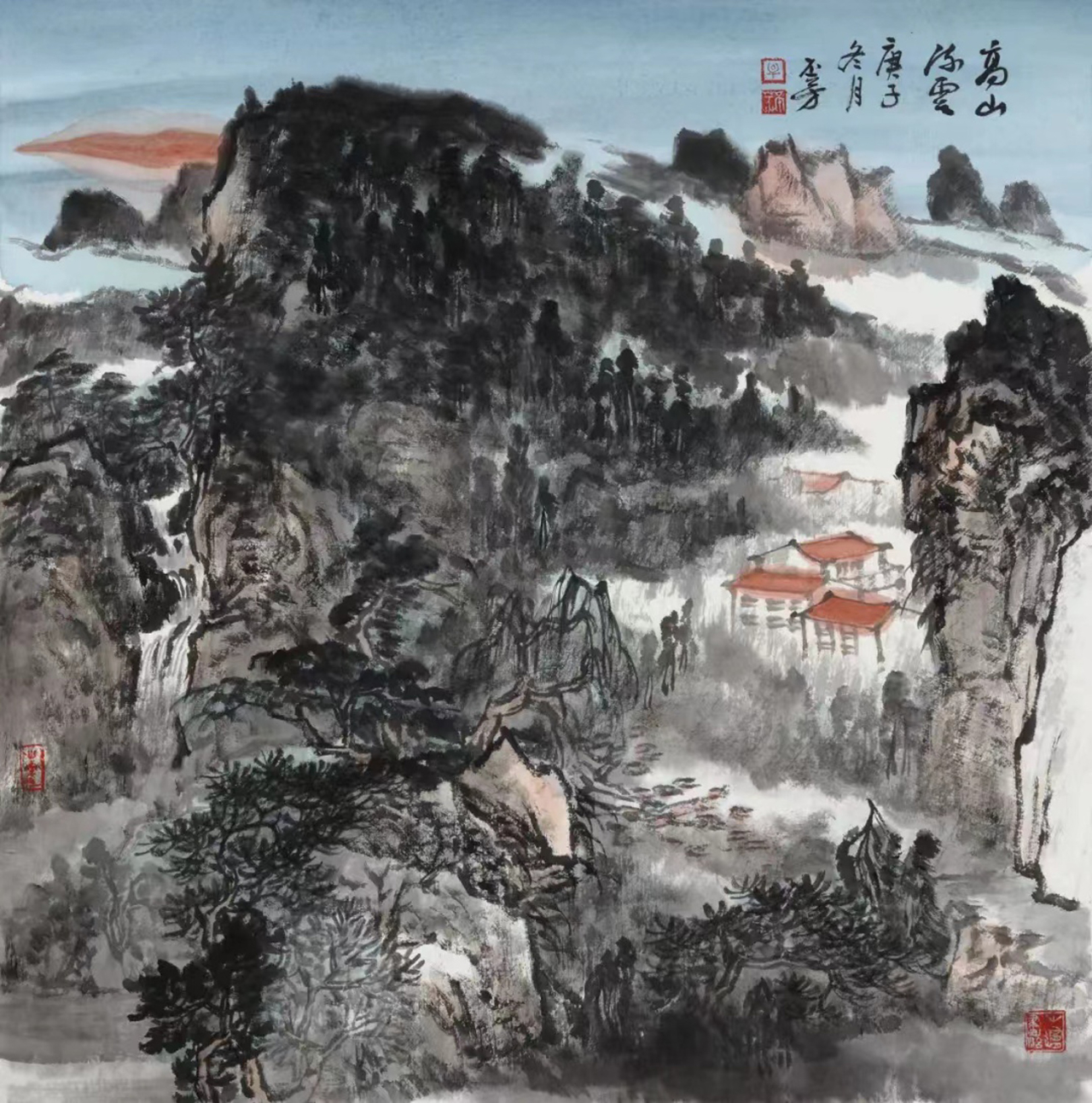 云雾是他画里的呼吸,是墨色里的留白诗。淡如纱的晨雾缠着屋舍的檐角,像情思绕着琴弦;浓如烟的暮霭裹着林木的梢头,像相思漫过窗棂;有时是云海里漏出的峰尖,像砚台里浮着的墨块,又似星子坠入夜海;有时是山腰间绕着的流岚,像素帛上晕开的水痕,又似蝶翼掠过花间。而那红顶的屋、黛瓦的舍,是云涛里泊着的舟——明明是水墨的清寒,偏添这一抹暖艳,像山风裹着灶火的香,像月光漫过酒盏,让高远的山河落了地,让清冷的画境生了温,像春雪融进春泥,像秋露沾上菊蕊。