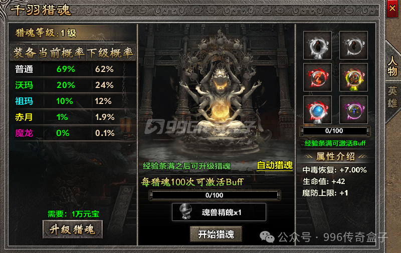 猎魂玩法也是重点,刷怪会概率掉落魂兽精魄,使用精魄猎魂后会随机获得一项属性加成。猎魂一百次可以激活BUFF,经验条满了可以升级猎魂。玩法还是很吸引人的,就是爆率不是很高,再加上人物和英雄各升各的,需要的材料就更多了!