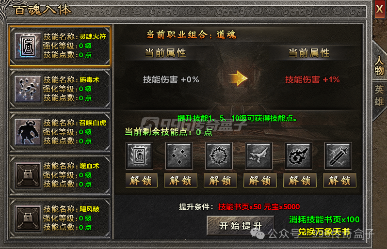 百魂入体是这个服的重点玩法之一,这个功能可以直接提升技能伤害,技能提升到一级、五级和10级,就能获得技能点,消耗这些技能点就能强化特定技能,还能根据自己的战斗风格选择不同的强化方向,自主性很高!升级技能消耗技能书页和元宝,这两个打怪都爆。