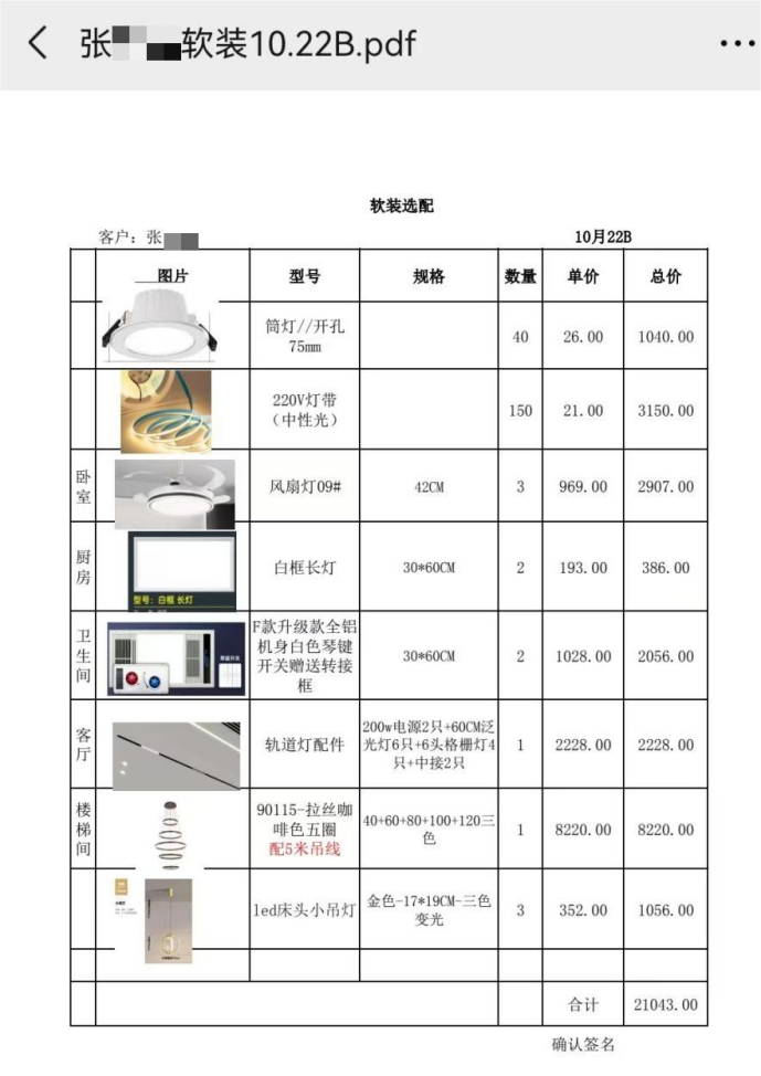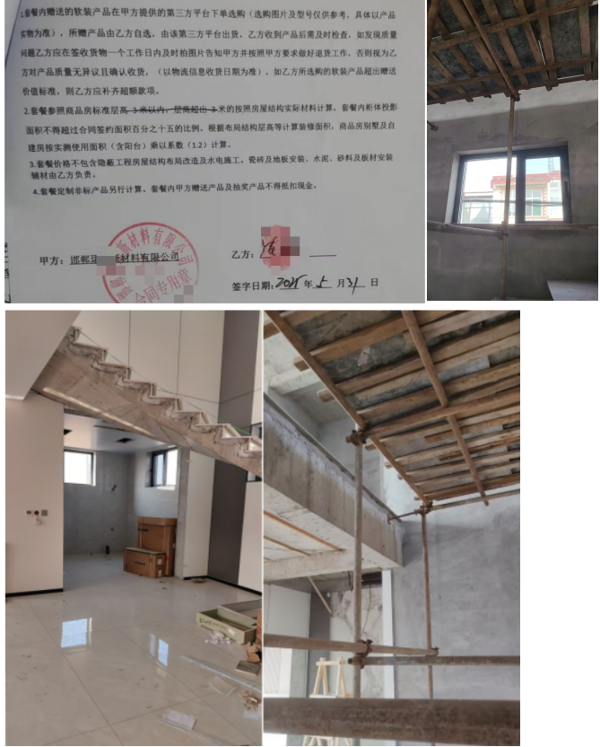 2024年5月,常年忙于工作的他为自建房规划全屋定制装修,经比对后选择了邯郸肥乡区新安镇的华北某公司,由公司廖总代为签订装修协议。协议约定装修面积163平方米,单价850元/平方米,总费用138600元,张先生分多次完成了支付。公司工作人员当时明确承诺,套餐涵盖墙面、屋顶、定制柜、套装门、楼梯等全套硬装,还提供33000元软装额度(含30000元产品及3000元物流人工补贴),可在外自行选购。
