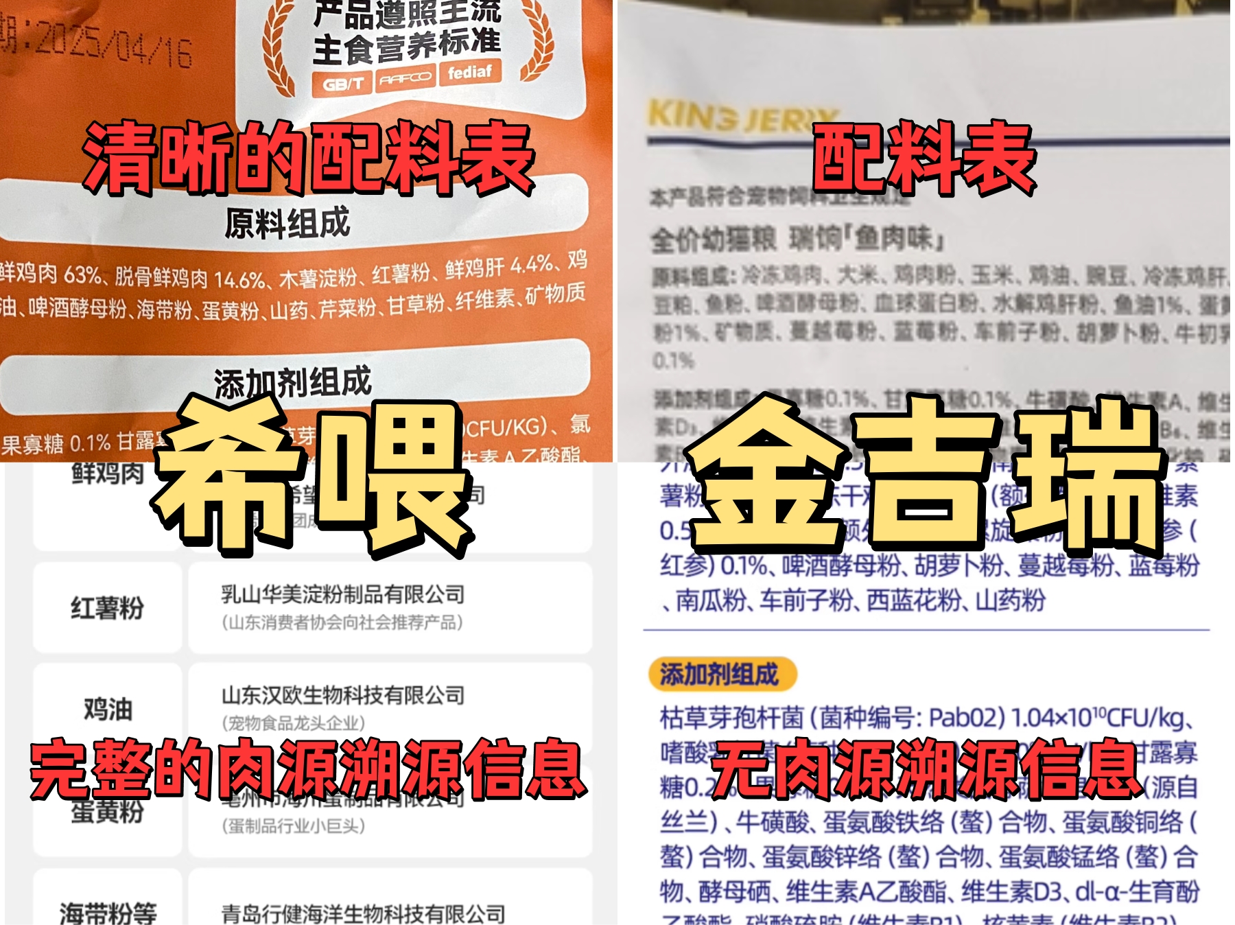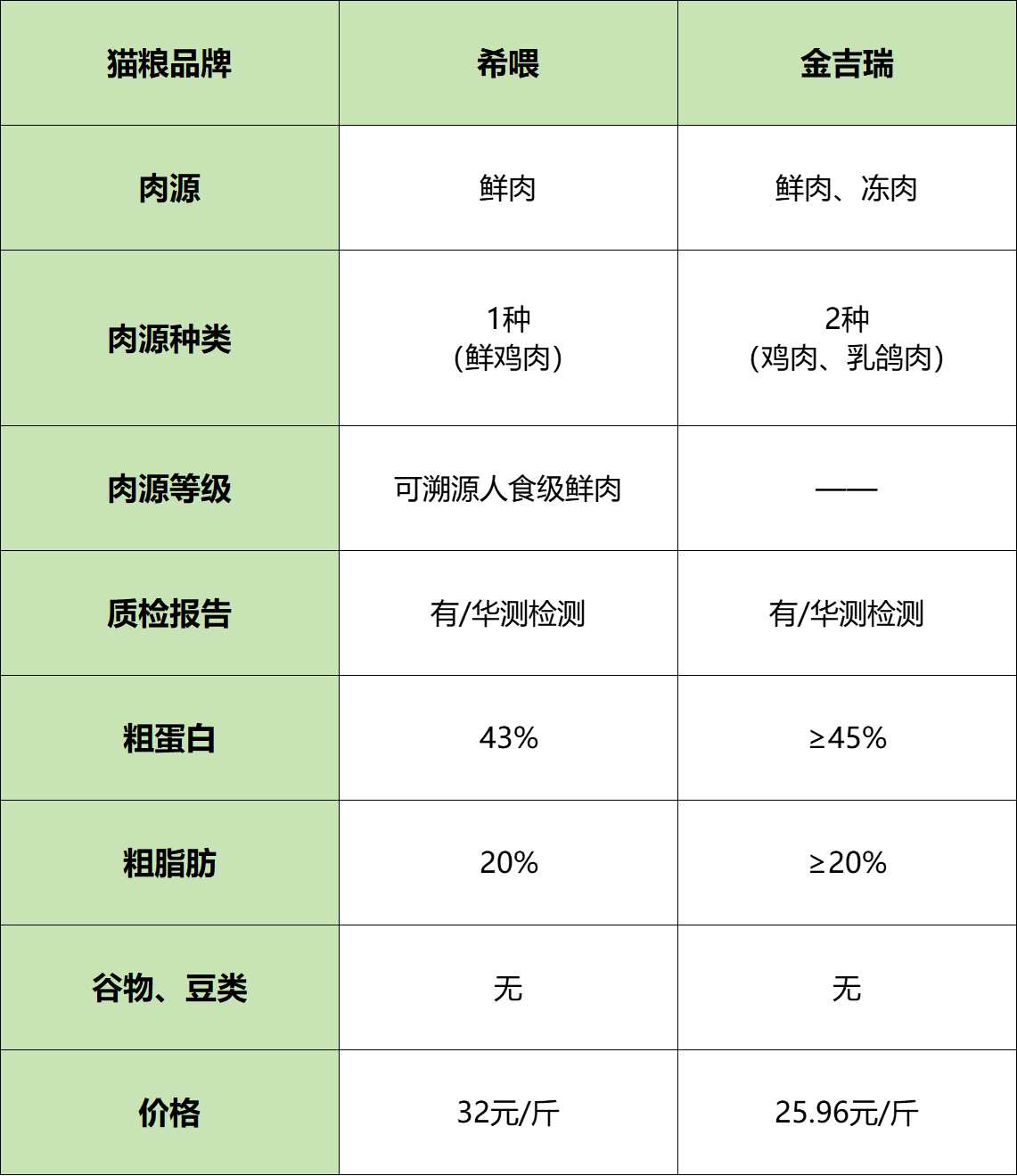 实测希喂、金吉瑞猫粮哪个牌子好?在深度评测前,我把两款猫粮的核心参数都查了一遍。从肉源品质到营养含量,从是否添加谷物到有没有第三方报告,每个关键点我都捋清楚了,这样评测结果会更靠谱。