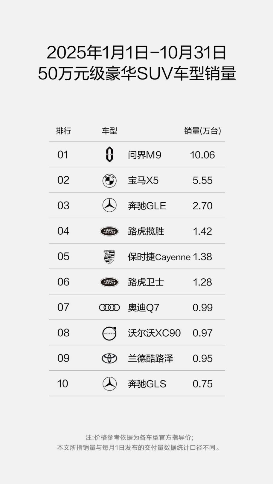 另外,根据最新销量数据显示,2025年1月1日-10月31日,问界M9以10.06万台的累计销量,牢牢占据50万元级豪华SUV车型销量榜单第一,强势锁定其在50万元豪华SUV市场的引领地位,重新定义了该细分市场的竞争格局与价值标准。