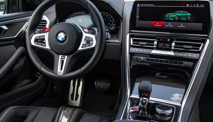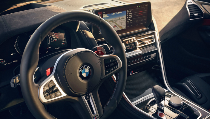 借助最新的iDrive系统和高级语音识别技术,车辆中控台配备了现代化的功能,既可以轻松操控音乐、导航和车辆设置,又能够满足驾驶者对于便捷、智能化控制的需求。这里还有一个令人兴奋的消息,显示屏幕周围采用了高档材质,如真皮和合金等摆脱了俗气的外观风格,赋予了中控台更加精致的体验。宝马M8所采用的方向盘不仅采用了高质感真皮材质包裹,还巧妙地在侧面加入了金属装饰,更加彰显出运动风格。更令人称道的是,在方向盘上还加入了换挡拨片,令驾驶者轻松掌控车速和方向。而新款仪表盘采用数字化设计,展现出极致现代风,底部更配备了炫酷的红色M标记,同时彰显出车辆强劲的动力性能。
