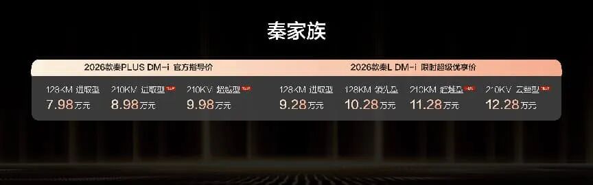 1月8日,比亚迪秦家族迎来加推上新,2026款秦L DM-i /2026款秦PLUS DM-i 210KM长续航版双车同步上市,售价区间为8.98-12.28万元。