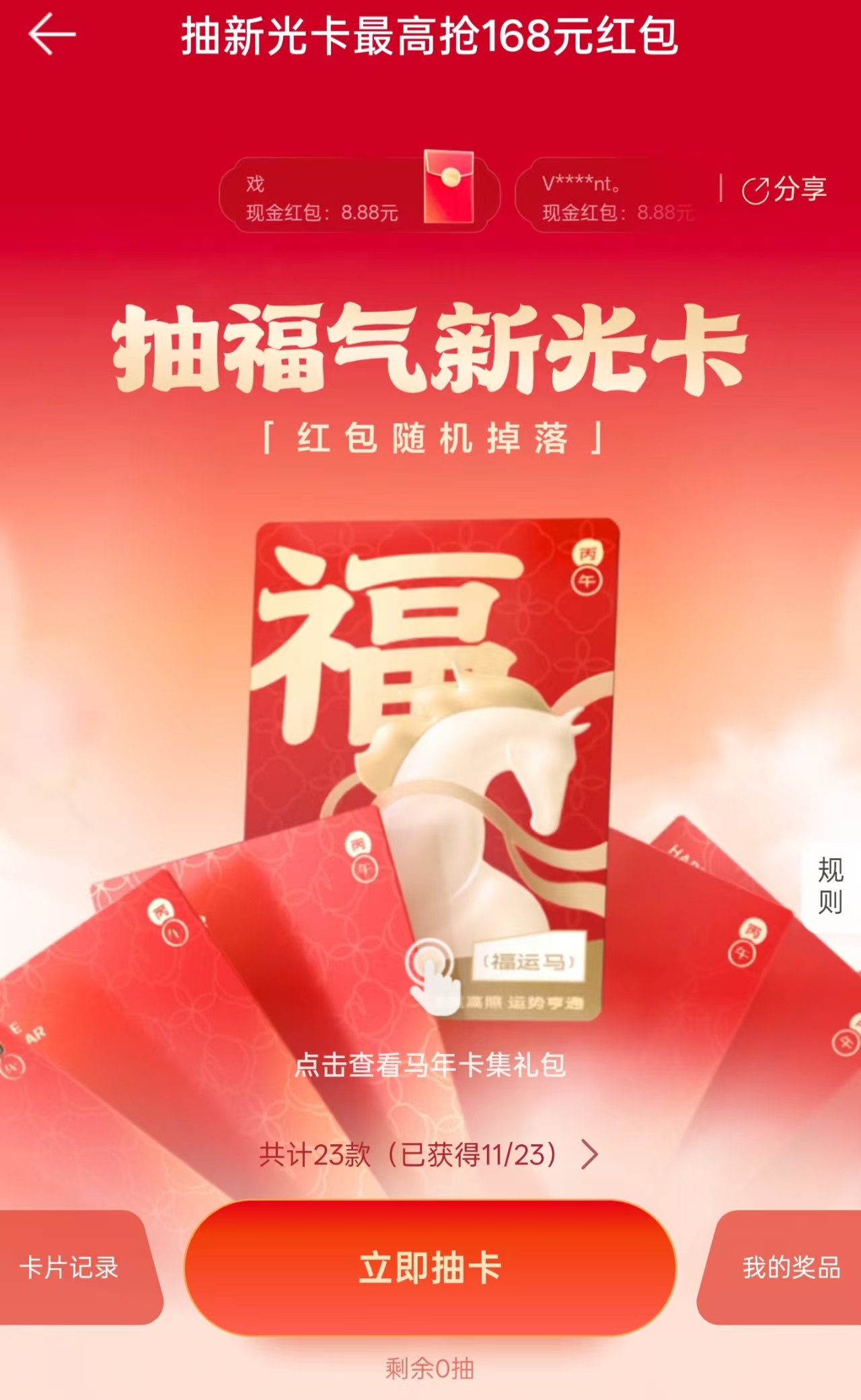 任务也是非常的简单,已经有小伙伴反馈抽到168,都去试试,抽卡越多红包越大!