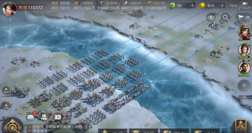 画面上,它采用精致手绘国风风格,人物立绘和UI设计都很有细节。剧情、台词和武将技能融入了大量的历史典故,地貌复现与即时制沙盘战斗表现,带来电影级的视觉冲击。技术力也很强,构建了3D无缝大地图,引入了动态环境变化如季节更替,部分赛季还加入AI精锐大营协防/佯动,增加了战场的变数。