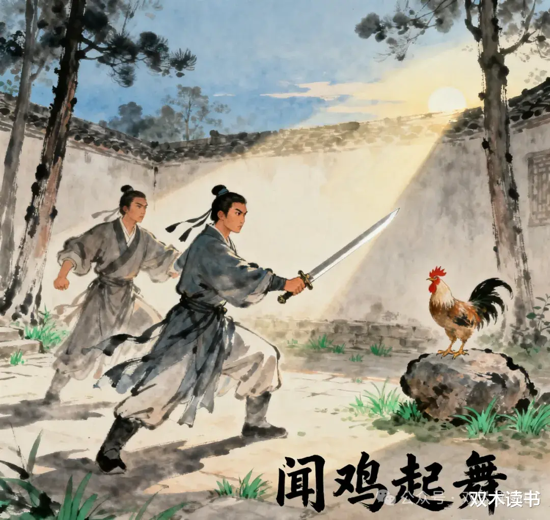 祖逖听到声音,猛地从床上坐起来,顾不上穿衣服,先推醒刘琨:“鸡叫了!快起来练剑!”