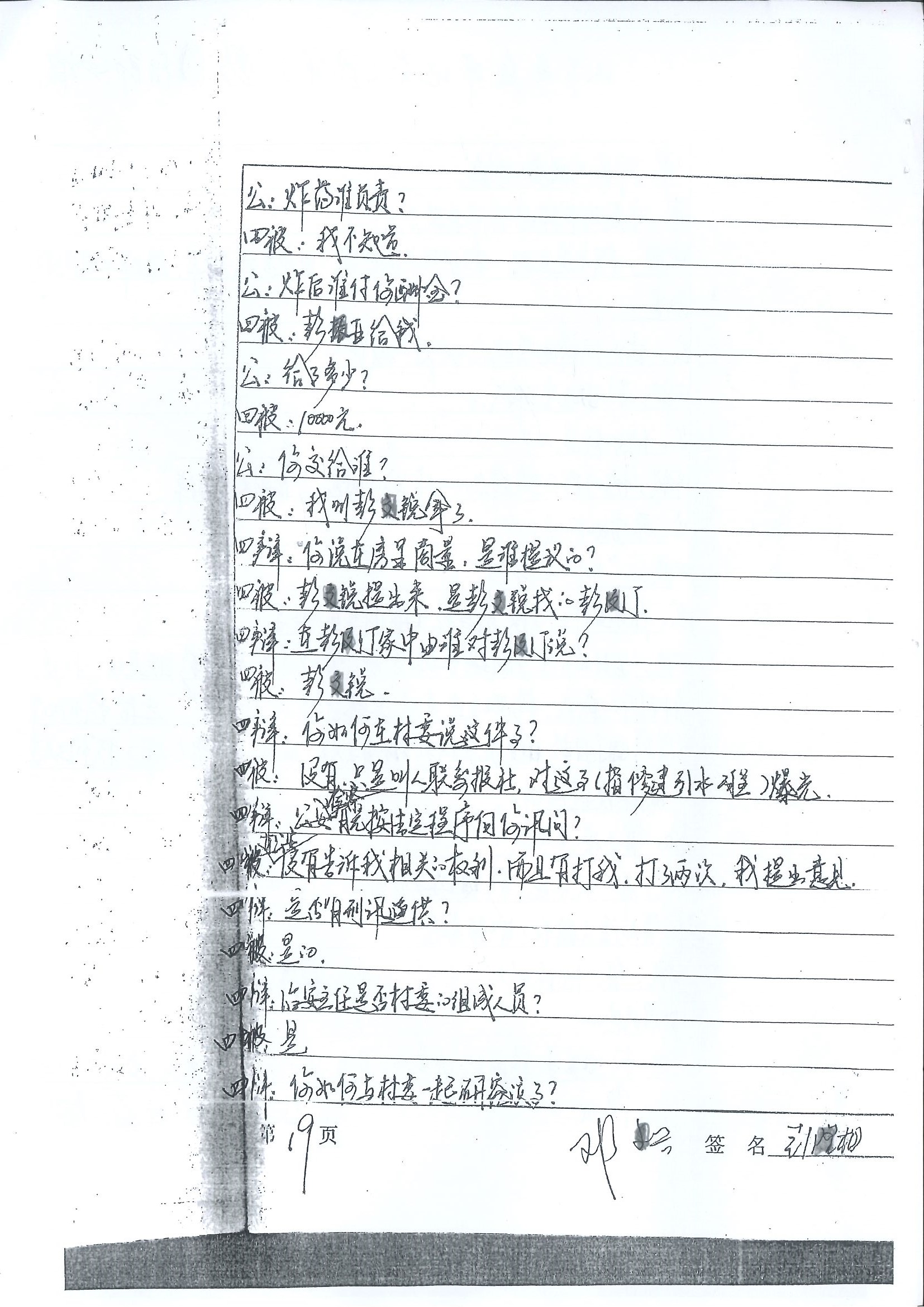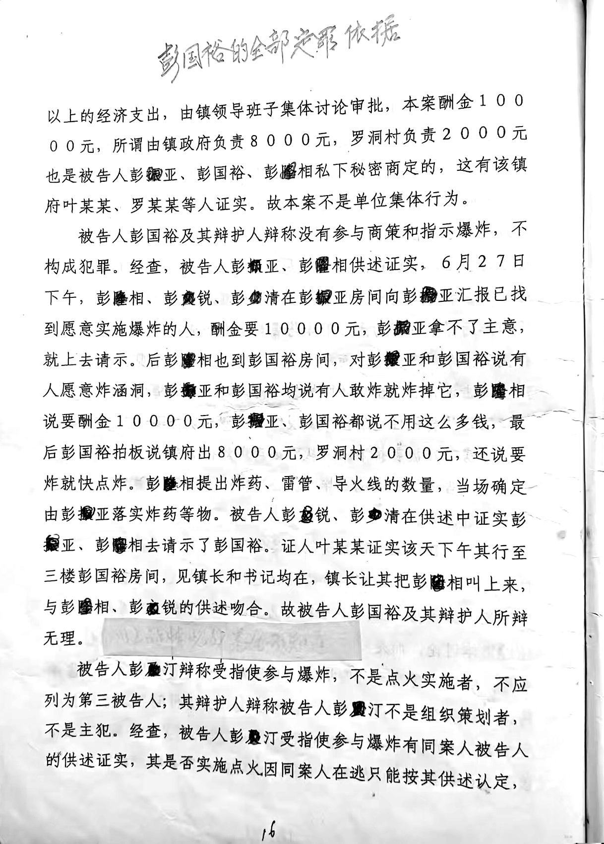 更为严重的是,彭国裕的公安审讯笔录被多次涂改。他始终为自己未参与爆炸行为辩护,并多次说明6月27日下午彭某亚和彭某相来他房间时,副镇长叶某美在场。在审讯笔录中,所有关于叶某美在场的语句全部被删掉了,取而代之的是彭国裕参与爆炸行为和来自首的虚假陈述。