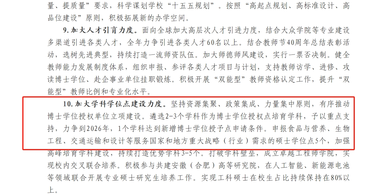 从合肥大学官方网站印发的《合肥大学2024年党政工作要点》通知内,我们可以提取相关关键信息,合肥学院将集中资源集聚优势,有序推动博士学位授予权单位立项建设,其中2-3个专业学科为博士授予点培育学科,争取至2026年一个学科可以达到新增博士学位授予点的申请条件。