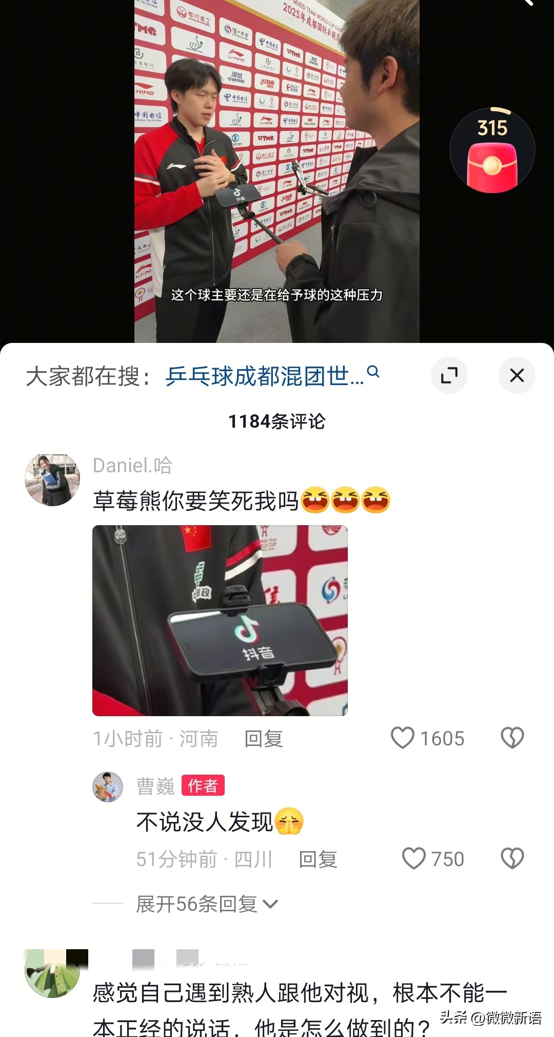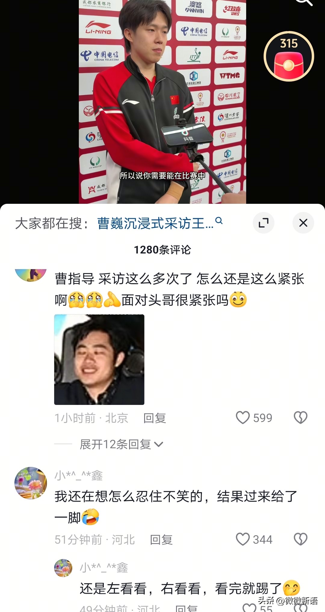 真的看一次笑一次,哈哈哈!其他三个都跑光了,丢他一个人采访,如果不是看到曹巍,估计楚钦也就离开了,王楚钦问曹巍:“你问啊,另外的价钱”。这孩子的梗又来了,曹巍开始提问了,但是听到曹巍紧张的声音都发颤,有网友说:“不是,你紧张啥?讲话似乎都有颤音。”虽然很熟,但是面对面采访头哥,曹巍还是紧张了。