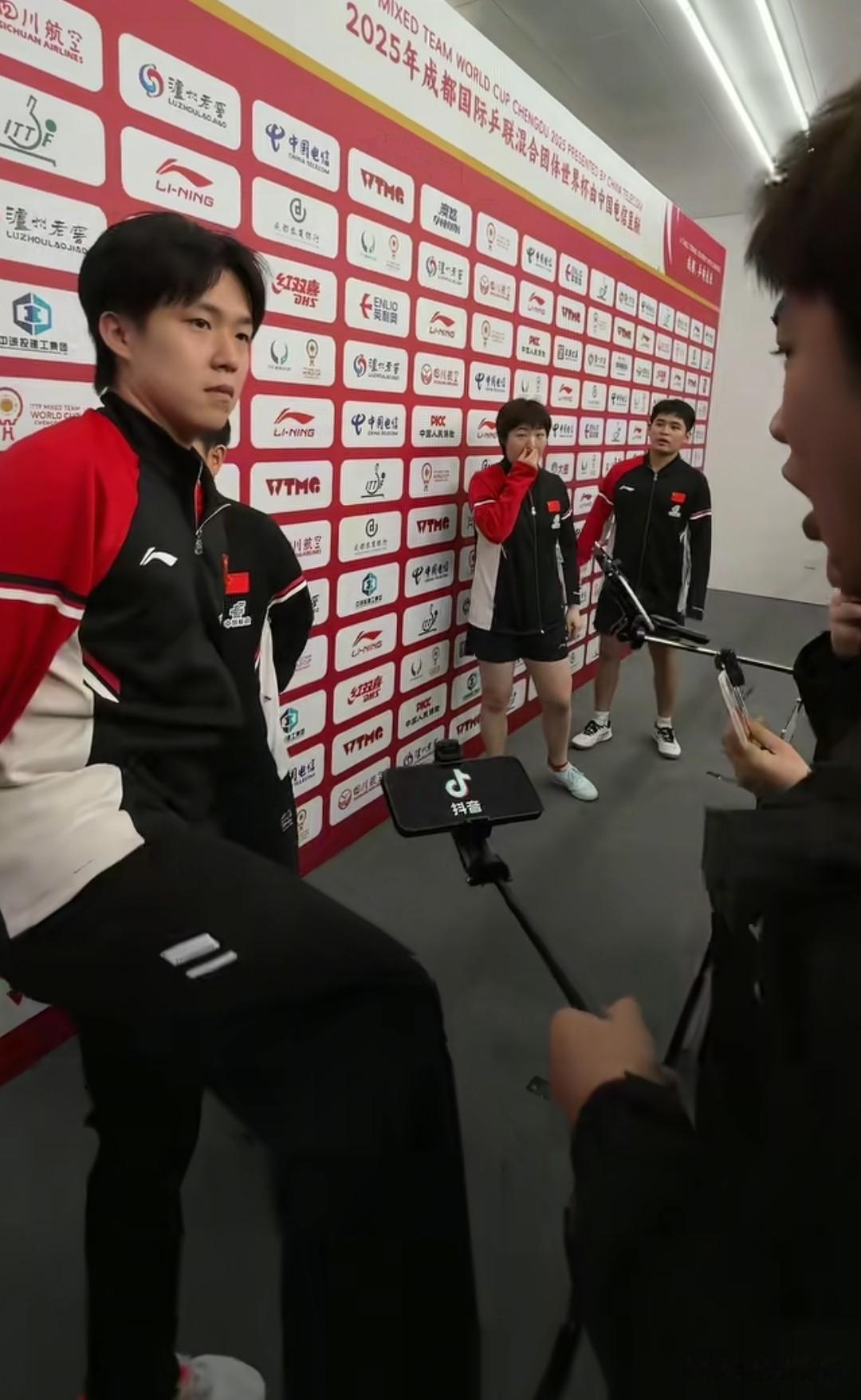 原来曹巍今天在赛后也去采访区了,刚刚看他更新了抖音:“祝贺中国队开门红!沉浸式采访来了”。中国队赢下比赛后,小周带着王楚钦、孙颖莎、蒯曼、林诗栋一起到了混采区,看到场外的记者也很多,他们过来先在前面站着接受了咪咕的采访。王楚钦一进来就看到曹巍了,蒯曼看到曹巍后也乐的,熟人的采访又来了。