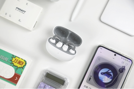 这款耳机采用2.5mm错位设计,能够自然地贴合耳朵轮廓,佩戴时不会产生压迫感。∠12弧面耳托的设计让重量均匀分布,长时间使用也不会觉得累。单耳仅4.5g的重量让人几乎感觉不到它的存在,配合亲肤的材质,即使戴着它工作一整天也很舒适。耳夹的松紧度经过精心调校,既保证了稳定性又不会过分紧绷。性能表现:
