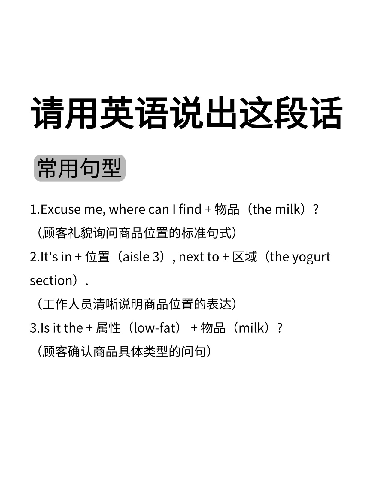 每天花5分钟练习2遍,下次遇到逛超市问位置的场景直接脱口而出,再也不用手舞足蹈比划啦~👉来练练口语,记住这 3 个万能句型 + 核心词汇不管找牛奶还是其他商品都能直接套英语小白也能轻松开口!