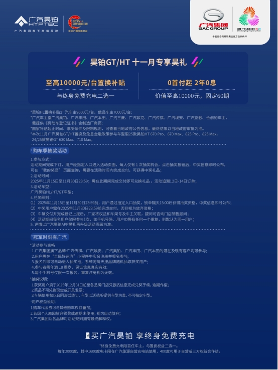 说到购车,昊铂HT的“铂金服务”相当贴心:终身三电质保、终身免费基础保养、终身送桩到家,这些服务实实在在地降低了用车成本。11月购车还可享受0首付起、2年0息的金融政策,以及至高10000元置换补贴。值得一提的是,昊铂HT还是广州警用车辆的同款车型,这份来自警用标准的认可,无疑为其品质做了有力背书。
