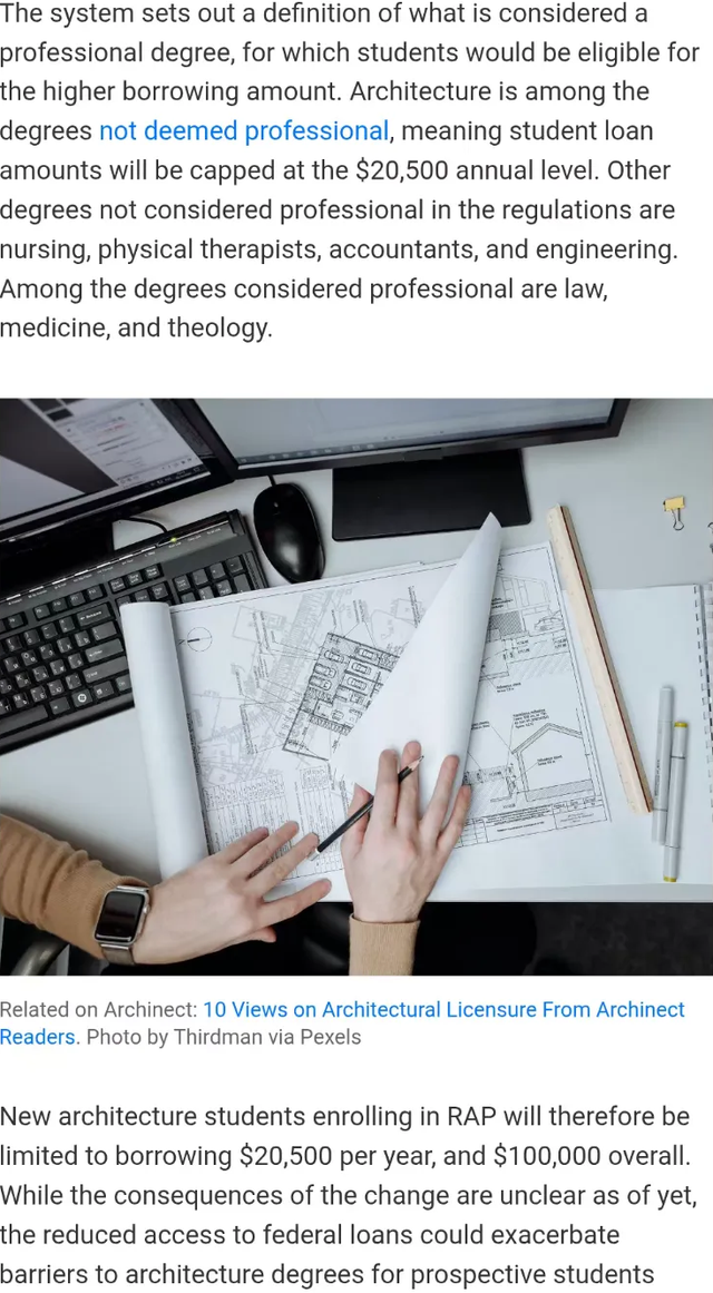 美国最近一项教育贷款政策的调整,让建筑学的研究生们面临更严峻的现实。受“大美丽法案”影响,建筑专业被移出了联邦高额贷款覆盖的“专业学位”名单。这意味着未来想读建筑硕士的学生,将无法像以前那样依赖政府的低息贷款来支付高昂学费,不得不转向自筹资金或利率更高的私人借贷。