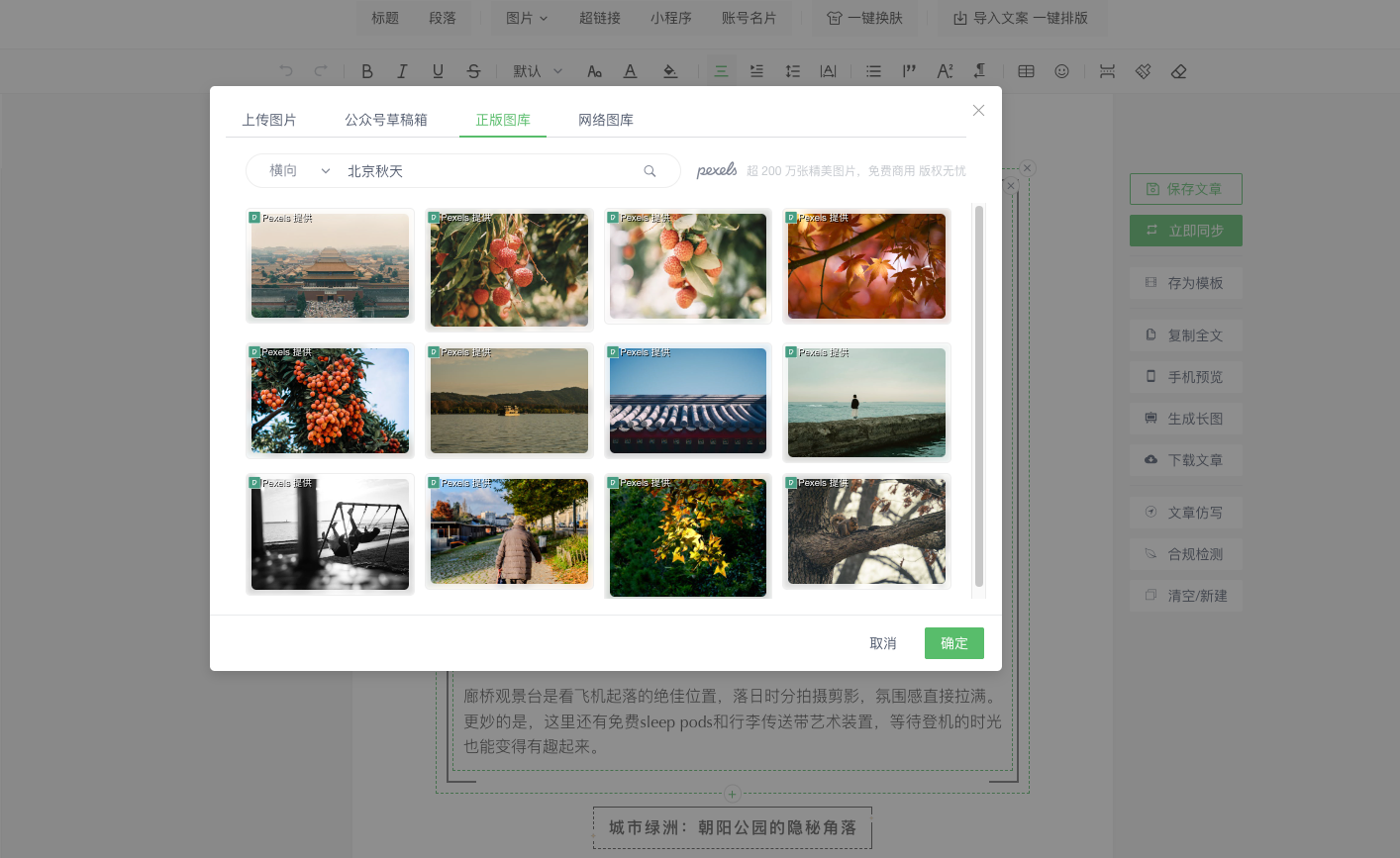 ●智能配图:AI配图、无版权风险图库、用户自有图库可以上传图片和批量管理
