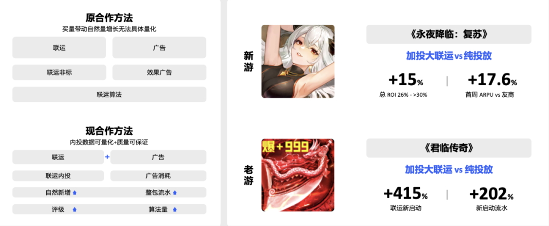 同时,OPPO还从广告场景上挖掘负一屏游戏榜单和桌搜等位置,提供【OPUSH】通知形式,新增了【卸载召回】功能。再加上与开发者紧密合作,推出【大联运模式】,用可量化的内投数据带动整包增长,开发者能通过API实时监控效果回传。如《永夜降临:复苏》加投大联运后总ROI从26%涨到30%,《君临传奇》这款上线多年的老游,更是实现了联运新启动415%的增长,重新焕发增长生机。显然,串联生态价值成了破局关键。