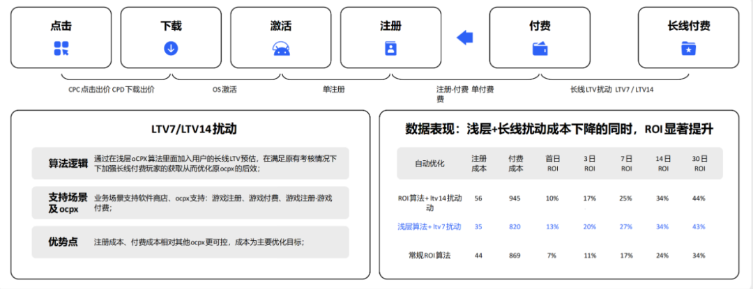 针对买量这一长线需求,OPPO告别单一算法形式,采用【浅层算法+长线LTV扰动】优化ROI,比如在游戏注册、付费等基础目标中,加入7天、14天用户生命周期价值预估,不仅可以把注册成本降低10%~20%,也能让首周ROI显著提升。
