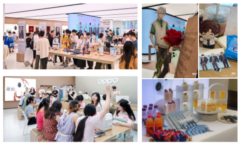 此外,OPPO还开启了线下门店合作活动。比如之前与《光与夜之恋》的出圈合作,在全国设置73家沉浸式主题店,导购化身“专属NPC”,用游戏话术为专业粉丝服务。