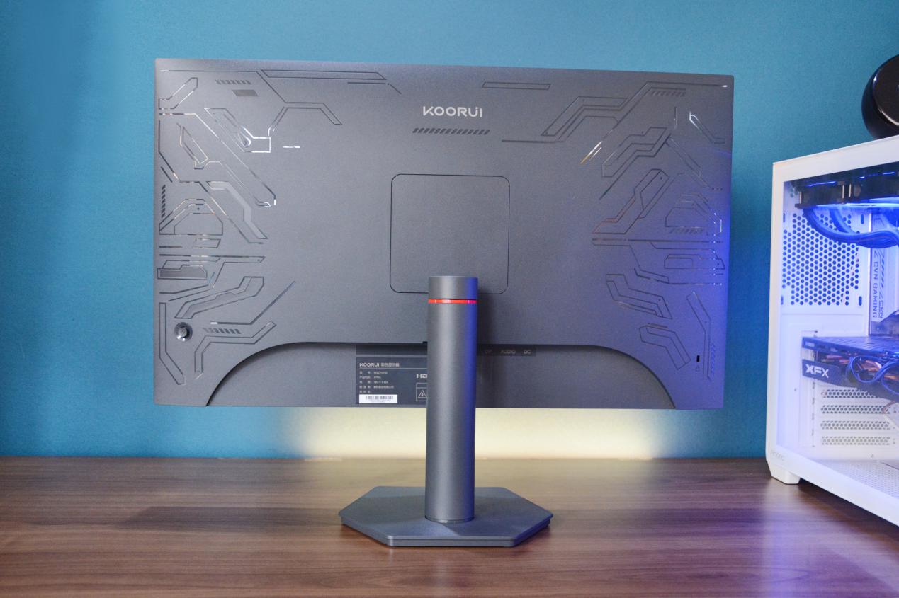 背面采用了科技感很强的赛博电竞纹路设计风格,整体主色调为灰色,支架中段采用红色环状点缀,打破单一色调,提升产品的辨识度,颇具电竞感。
