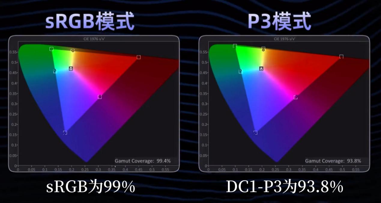 可以看到在sRGB和DC1-P3色彩空间下,分别测的极限数值:sRGB为99%,DC1-P3为93.8%,大家可以参考。