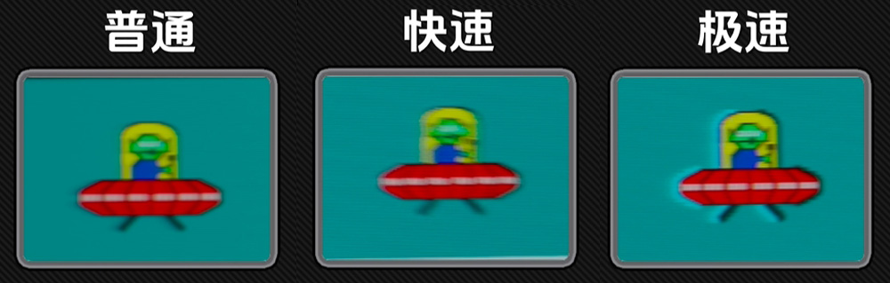 游戏之前先经行OD档位测试与调节,科睿X7Pro一共预设了三个档位,分别是普通、快速和极速。通过UFO小飞碟测试可以看到,快速档位应该是最佳。极速档位时,虽然达到了更快的响应时间,但是拖影就比较明显了。