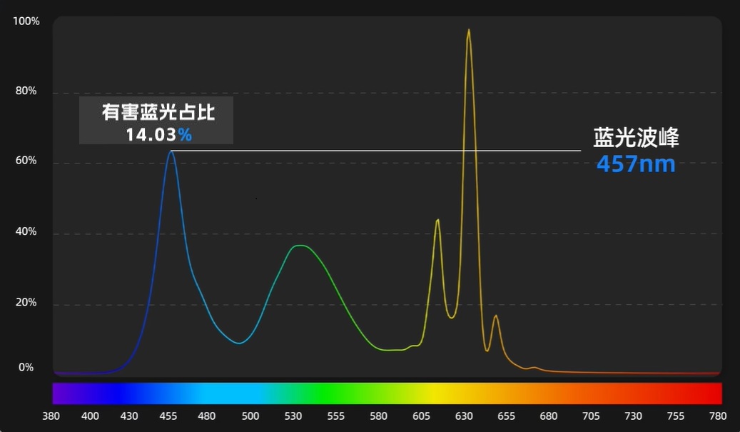 在标准模式下,用光谱仪实测蓝光波峰数值在457nm左右,有害蓝光占比在 14.03%,符合硬件低蓝光标准。