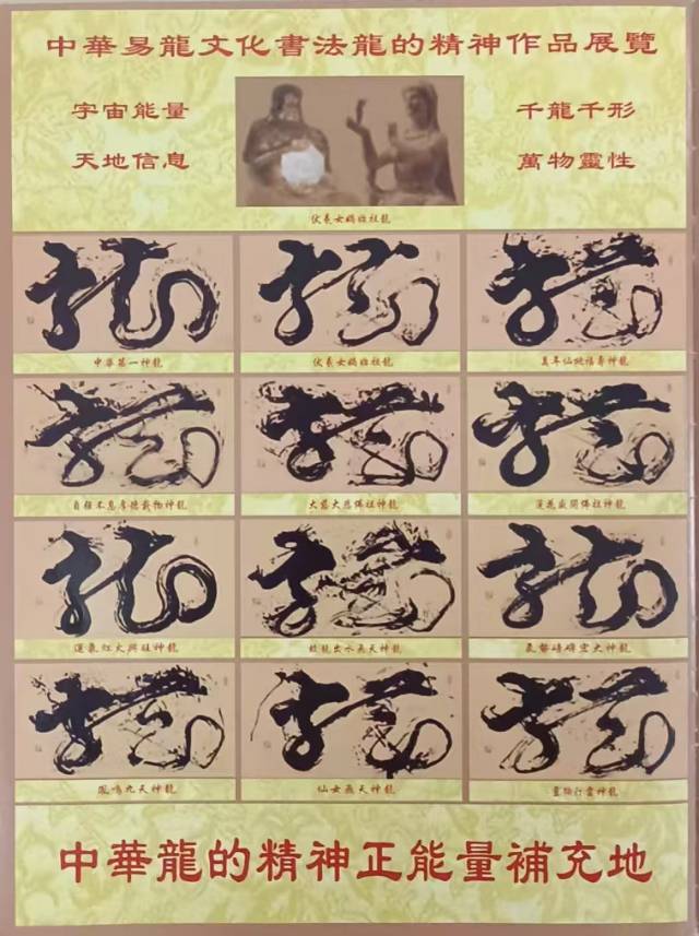 伏羲女娲始祖神龍,代表祭祖文化一一是中华民族万年长存之根本。此图腾六秒钟一口气一笔写成,此神龍前后变化非常神奇,左边是凤凰,然后凤凰尾巴变成右边龍头上的龍角,然后由实到虚,由内到外,在龍身中部变成外面粗犷的伏羲男人头像,里面清秀的女娲女人头像,女主内男主外。还有手掌上坐着一儿一女伏羲女娲的后代。再变成一根一根向上向后甩出的头发,再变成实的手臂,再变成五个手指握紧的拳头,然后,再变成强大的气流直冲云霄。变化衔接神秘莫测,妙不可言。它揭示了中华民族易文化和祭祖文化神奇魅力万年不衰。龍是中华民族的精神和图腾。伏羲女娲人首蛇身,龍的精神和龍的传人就是从这里开始的。伏羲发现了易,并画八卦传道,创造了易文化。女娲抟黄土造人,给了中华民族血肉身躯,养育了中华民族。并炼五色石以补天,挽救了大自然,拯救了人类。伏羲女娲共同创造了龍的精神,易文化是中华文化之根,是中华民族智慧的源泉和百家百艺学问的源头。伏羲女娲是中华民族的人文始祖,也是中华民族始祖龍,炎帝黄帝为中华民族太祖龍。甘萧天水是中华文明始祖伏羲的诞生地,自2005年起,甘萧省委省政府每年都要举行伏羲祭祀活动,前台湾国民党主席连战和前亲民党主席宋楚瑜去黄帝陵祭拜,以示台湾和大陆血脉相连,拥有共同的祖先。中华文化和中华文明是在祭祖中传承下来的,在祭拜中华民族伏羲女娲始祖龍和炎帝黄帝太祖龍的时候,我们弘扬了龍的精神,传承了中华文明,凝聚了中华民族,构建了天下一家亲的和谐社会。
