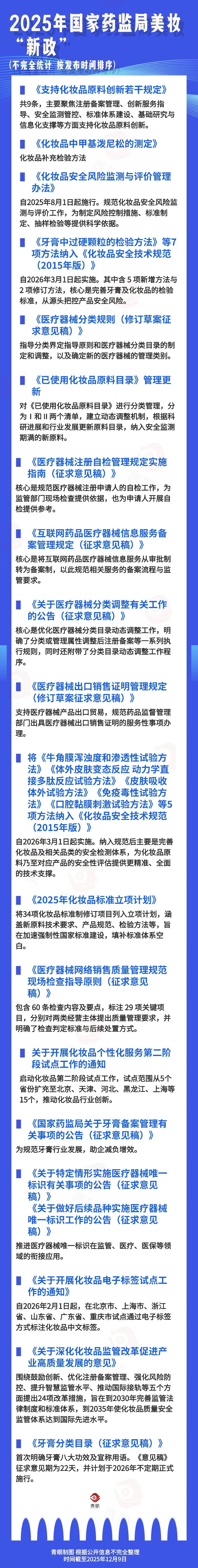 不仅如此,青眼梳理发现,2025年以来,国家药监局已累计发布20项核心美妆“新政”,涵盖正式规定、征求意见稿及标准立项计划等多类文件。