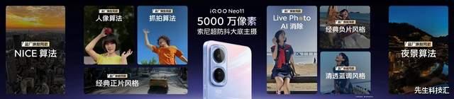 影像方面,Neo11后置5000万像素索尼IMX920大底OIS主摄,引入蓝厂旗舰NICE算法,纯净夜景、疾速抓拍、零延时LivePhoto一次成片。新增风格化光斑、负片、正片、清透蓝调等滤镜,以及AI消除、AI修图大师,让创作更自由。
