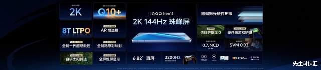 Neo11携手京东方打造6.78英寸2K 144Hz珠峰屏,首发Q10+发光器件,峰值亮度4500nit,45°色偏仅1.7 JNCD;8T LTPO实现1-144Hz无级变速,同等亮度功耗较传统2K屏降低20%,达成“2K画质、1.5K续航”。屏幕采用圆偏振光硬件护眼、2592Hz全亮度高频PWM+类DC调光,SVM 0.03刷新行业低闪记录;3200Hz瞬时触控采样率与300Hz十指稳定采样,湿手、汗手精准响应。AR增透膜透光率95.4%,配合自研太阳算法与超声波3D指纹,户外可视性与解锁体验再进阶。