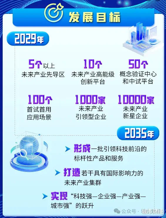 到2035年,未来产业全过程创新链基本完善,形成一批引领科技前沿的标杆性产品和服务,打造若干具有国际影响力的未来产业集群,产业规模持续壮大,实现“科技强—企业强—产业强—城市强”的跃升,成为全球未来产业重要策源地和发展高地。