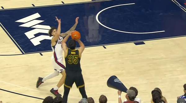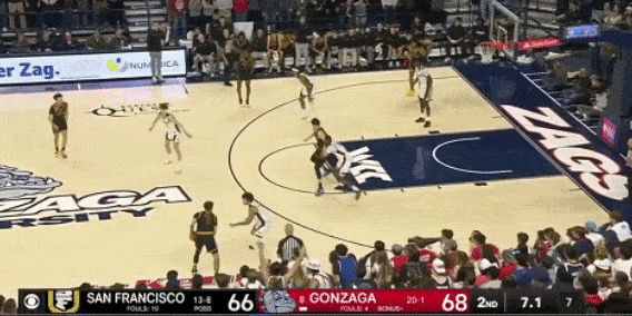 旧金山打快攻反击,但是冈萨加回防很快,王俊杰低位落位要球,三位队友三分线外拉开空间,清空一侧区域,王俊杰背身单打,