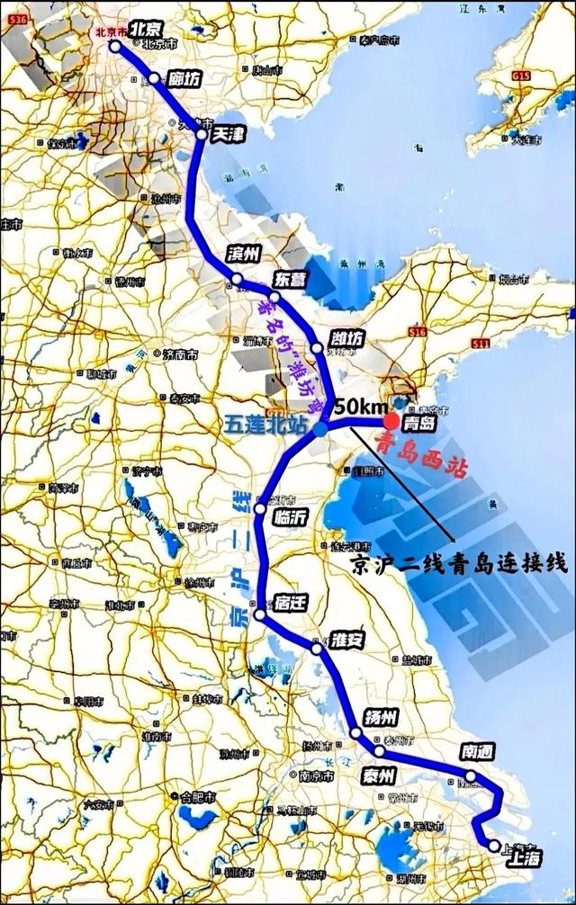 青岛太靠东,京沪2线很难经过它。虽然拐了一个很大的“潍坊湾”,但相距仍尚远。离最近的青岛西站还有50多公里。