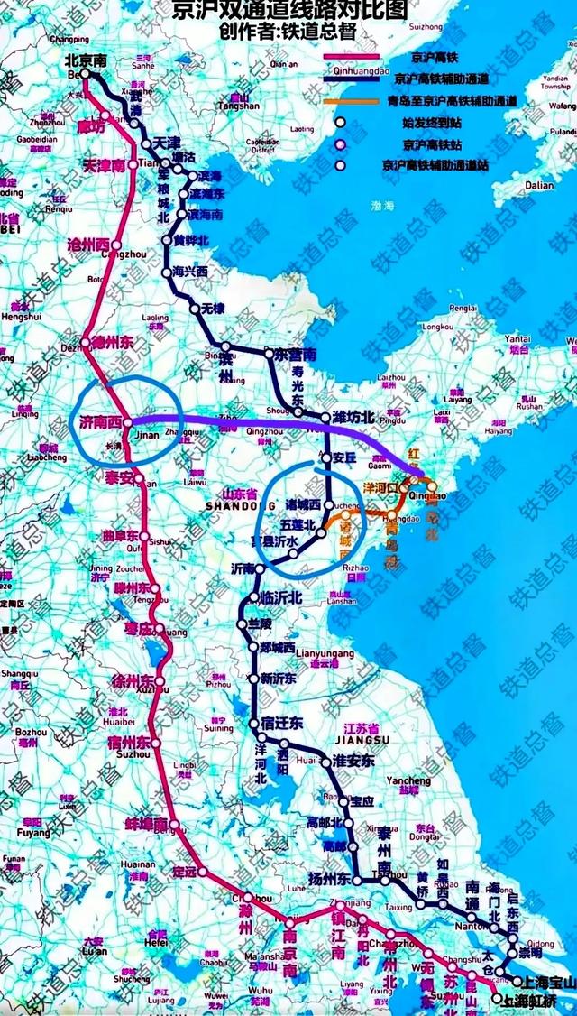 原来是必须这样走的:从青岛走青济高铁先到济南,去找京沪高铁;然后转入京沪高铁,进行南下或北上(见下图)。