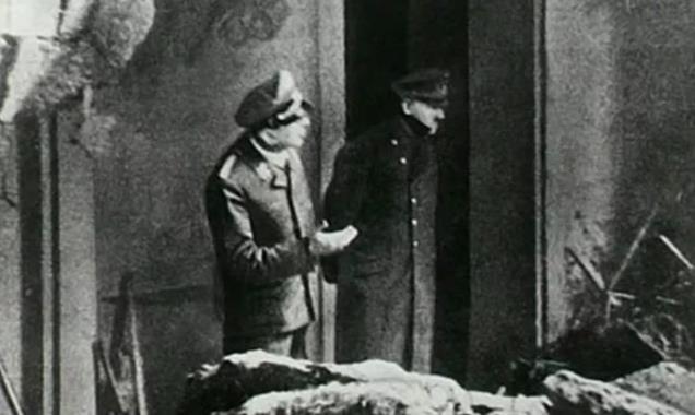 在希特勒结束生命的前两天,一张照片记录了他站在柏林地堡外的情景,当时,他正在听取副官总长尤里乌斯·绍布关于盟军轰炸柏林的汇报。