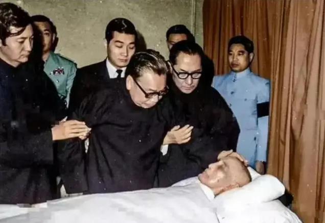 不过遗憾的是,蒋介石还是于不久之后在台湾遗憾离世,照片上是蒋介石的儿子蒋经国在他遗体前沉痛告别的画面。
