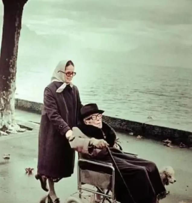 照片中的卓别林拄着拐杖坐在轮椅上,此时的他面色看起来十分不好,瘦弱的身体佝偻着缩在一起,而他的家人在后面推着车在陪他出门溜达。